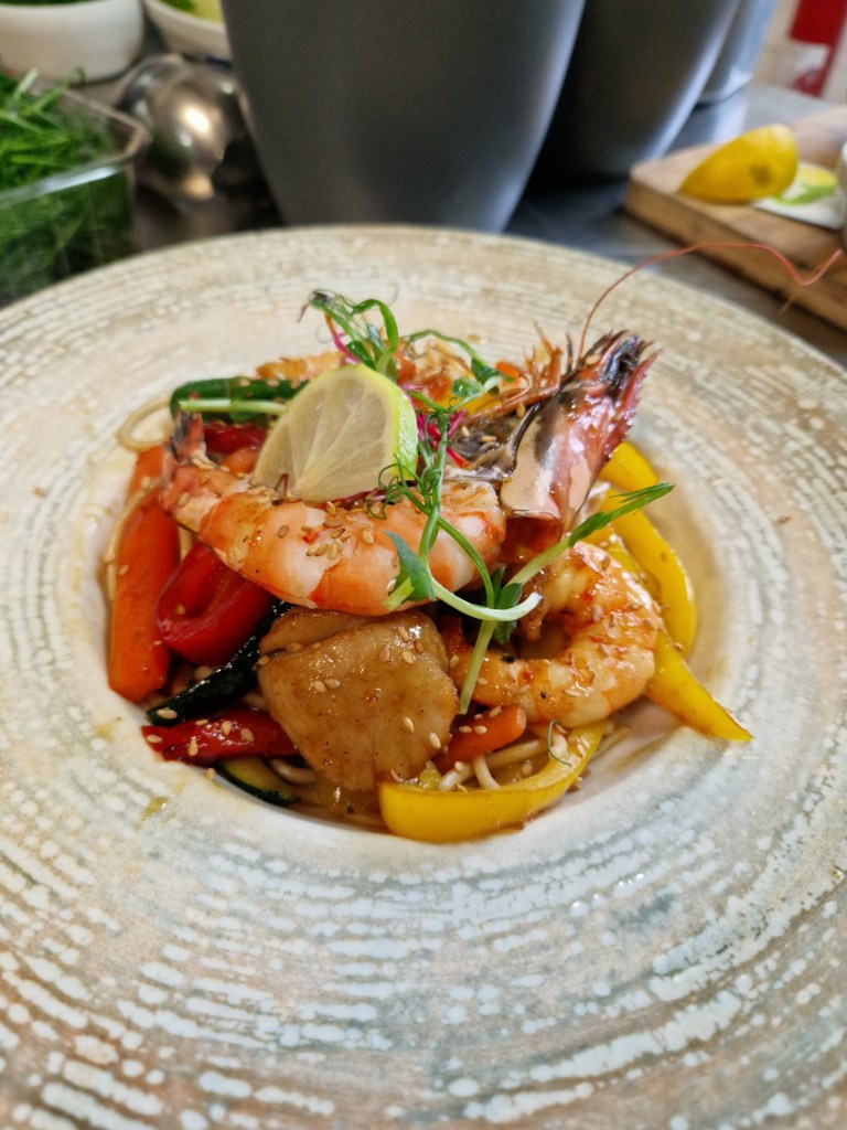 assortiment de poissons selon arrivage, Gambas et Saint-Jacques scnackées